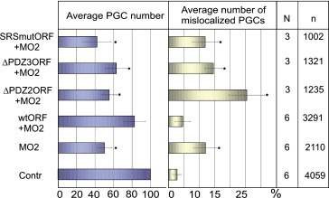 Fig. 6. Coinjection of wtORF XGRIP2.1 can rescue the average PGC number and anteroposterior positioning of PGCs induced by 0.2 pmol of MO2 XGRIP2.1. Mutations within PDZs 2 or 3 abolish the rescuing activity. Embryos were injected vegetally into both blastomeres at the 2-cell stage. nânumber of PGCs scored, Nânumber of independent injections. ââp(t) < 0.05.