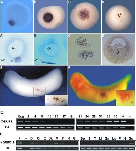 Fig. 1. Analysis of XGRIP2.1 expression by whole mount in situ hybridization and RT-PCR. (AâF) The localization of XGRIP2.1 mRNA in Xenopus oocytes and embryos was analyzed by whole mount in situ hybridization, followed by vibratome sectioning (Aâ²âDâ²). In stage I oocytes, XGRIP2.1 mRNA was detected in the mitochondrial cloud (A, Aâ²) and at early stage III at the tip of the vegetal cortex (B, Bâ²). At the 2-cell stage of embryogenesis, XGRIP2.1 mRNA is enriched in granular patches of germ plasm at the vegetal pole (C, Câ², vegetal pole view). At gastrula stage, the transcript was detected in isolated cells within the endoderm (D, blastoporus view, arrow in panel Dâ²). At tailbud stage, XGRIP2.1 is specific to the migrating germ cells (E, lateral view of the embryo with the head to the left). XGRIP2.1 and Xpat RNAs colocalize in migrating PGCs at tailbud stage of embryogenesis. Embryos were sequentially stained for XGRIP2.1 (blue) and Xpat (red, magnified view in the inset, the first staining of the same embryo) (F, lateral view of the embryo with the head to the left). RT-PCR analysis of the temporal expression during embryogenesis (G) and tissue-specific expression of XGRIP2.1 (H). Total RNA for RT-PCR was prepared from embryos or from adult tissues. Abbreviations: Gvâgerminal vesicle, Mcâmitochondrial cloud, Vcâvegetal cortex, Bcâblastocoel, Bâbrain, Oâovary, Eâeye, Skâskin, Mâmuscle, Fâfat, Kâkidney, Gâgall bladder, Spâspleen, Iâintestine, Tâtestes, Liâliver, Smâstomach, Luâlung, Pâpancreas, Hâheart, Scâspinal cord. |