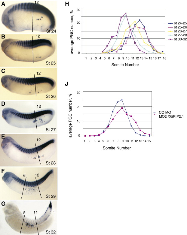 Positioning of PGCs along the A/P axis in control and XGRIP2.1 morphant embryos. (AâH) Representative examples of uninjected control embryos exhibiting normal PGC positioning between stage 24 and stage 32. PGCs were stained for Xpat and somites for XMyoD by WMISH. (AâG) Embryos were cleared with benzyl benzoate/benzyl alcohol. (H) PGC migration profile of uninjected control embryos (stage 24â33). (J) The PGC distribution profile of embryos at stage 32 injected vegetally into both blastomeres at the 2-cell stage with 0.2 pmol of MO2 XGRIP2.1 or CO MO. Average PGC numbers at each somite position were calculated from results of 3 independent experiments. A total of 60 embryos were analyzed for each stage of development or treatment.
