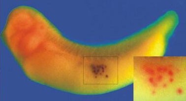 Primordial germ cells in the embryo stain in blue, confirmed by counterstain for the gene pgat (Primordial germ cell-associated transcript protein) (inset, in red). |