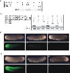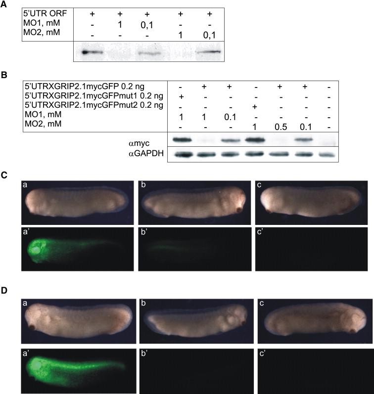 Fig. 2. XGRIP2.1 MO1 and MO2 inhibit translation of XGRIP2.1 in vitro and in vivo. (A) Reduction or absence of XGRIP2.1 translation was observed in the coupled in vitro transcription/ translation reaction (Promega) upon addition of 1 nmol or 0.1 nmol of either MO1 or MO2, respectively. (B-D) Two-cell stage embryos were injected vegetally into both blastomeres with either 5âUTRXGRIP2.1mycGFP or 5âUTRXGRIP2.1mycGFPmut (see Materials and Methods) RNA together with XGRIP2.1 specific MOs and grown to tailbud stage (st. 30). (B) Total protein extracts of injected embryos were subjected to Western blotting. The recombinant mycGFP reporter protein was no longer detected at high concentrations of either MO1 or MO2. (C, D) mycGFP reporter protein expression analyzed by fluorescence microscopy. (a-c) normal light, (aâ-câ) UV-light. Two-cell stage embryos were coinjected with 0.2 ng 5âUTRxGRIPmycGFPmut1 RNA and 2 pmol MO1 (C, a, aâ), 0.2 ng 5âUTRXGRIP2.1mycGFP RNA and 0.2 pmol MO1 (C, b, bâ), 0.2 ng 5âUTRXGRIP2.1mycGFP RNA and 2 pmol MO1 (C, c, câ), 0.2 ng 5âUTRXGRIP2.1mycGFPmut2 RNA and 2 pmol MO2 (D, a, aâ), 0.2 ng 5âUTRXGRIP2.1mycGFP RNA and 0.2 pmol MO2 (D, b, bâ), or 0.2 ng 5âUTRXGRIP2.1mycGFP RNA and 1 pmol MO2 (D, c, câ).