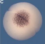 Fig. 3. Examples of phenotypes induced by overexpression of PDZ 23. Embryos were injected vegetally into both blastomeres at the 2-cell stage, grown to stage 31-32 and subjected to WMISH. (A) Control embryos exhibit normal average PGC numbers and positioning along the A/P axis. (B, C) Embryos injected with 2 fmol (B) or 4 fmol (C) of PDZ 23 RNA exhibit reduced average PGC numbers and PGC mislocalization along the A/P axis.