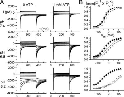 Figure 1. Effects of 1 mM cytoplasmic ATP on CLC-1 at three intracellular pH conditions. (A) Recording traces were obtained in the indicated pH and ATP conditions using voltage protocol A. (B) Normalized current (Inorm) represents the initial, tail current normalized to the maximal initial current in the absence of ATP. Each data point is the average from 3–6 patches. This Inorm value reflects the product of the fast-gate Po and the common-gate Po, namely Pof × Poc. Solid and open symbols were in 0 and 1 mM cytoplasmic ATP, respectively.
