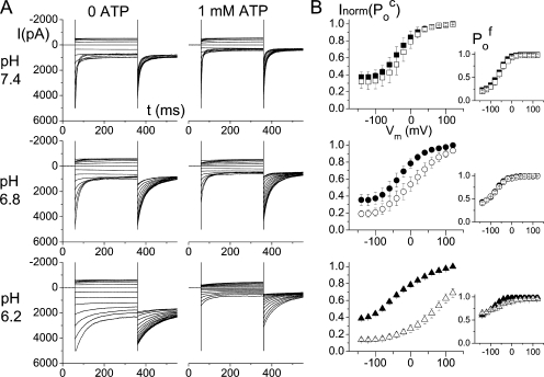 Figure 2. Effects of 1 mM ATP on the common gate of CLC-1. (A) Recording traces obtained in the indicated conditions using voltage protocol B. (B) Normalized value of the initial tail current (Inorm) in each pH condition (as shown in A). This Inorm value has been widely used to represent the Po of the common gate (Poc). Dividing the Inorm in Fig. 1 B (from protocol A) by the Inorm here (from protocol B) gives the fast-gate Po (Pof), which is shown in the inset of each panel. Solid and open symbols were obtained in 0 and 1 mM cytoplasmic ATP, respectively.