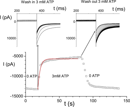 Figure 4. Reversible ATP inhibition on the CLC-1 common-gate activity at pH 6.8. Top panels show recording traces by a pulse protocol of +40 mV test voltage (300 ms), followed by the short pulse to +170 mV (400 μs), and finally the tail voltage step at −120 mV. The recorded traces were shown around the initial tail current for those traces during ATP wash-in (left) and wash-out (right). Each recording trace is separated by 2 s, and the initial value of the tail current in each trace is plotted against time at the bottom panel. The red curve represents a single-exponential fit with a time constant of 3.4 s, which does not fit the ATP wash-in process well. Three other patches show the same results from such ATP wash-in and wash-out experiments.