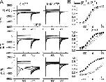 Figure 3. Dependence of the V1/2 of the common-gate Poc–V curve on the ATP concentration in three different pH conditions. Each data point is the average from 3–7 patches. Solid curves are drawn according to a Michaelis-Menten equation with the ATP half-effective concentration and the saturated V1/2 value of 0.31 mM and −20 mV (pH 7.4), 0.40 mM and +49 mV (pH 6.8), and 0.12 mM and +91 mV (pH 6.2).