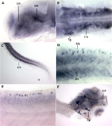 Figure 2. In situ hybridization. A â D: Fish stained at 24 hpf. A. Staining is apparent in the olfactory placode (OP) and the midbrain (Mb). B. Dorsal mount showing staining in the trigeminal neuron (Tg) and in the rhombomeres of the hindbrain (Hb). C. Staining in spinal cord and skeletal muscle (sm). D. Higher magnification of Rohon Beard cells (RB) flanking skeletal muscle (sm). E. Fish at 48 hpf with staining in the Rohan Beard cells of the spinal cord (SC) and in the skeletal muscle. F. Staining throughout the brain, at the olfactory pits (OP), in the layers of the retina, and in the trigeminal ganglion (Tg) of fish at 72 hpf.