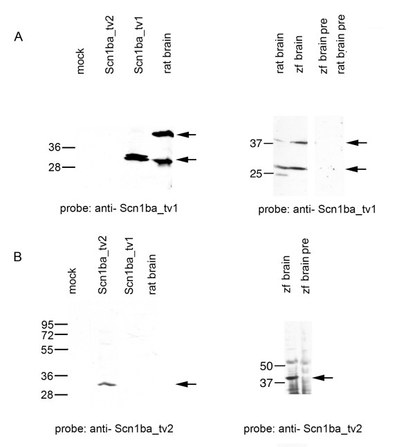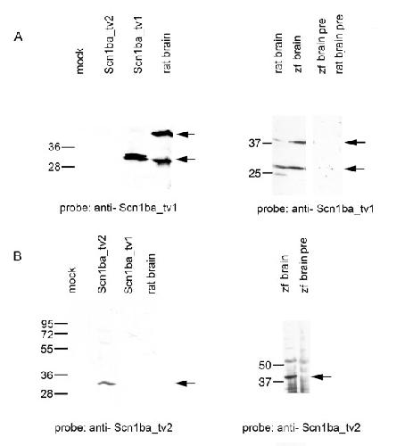 Figure 3. Antibody characterization. A. Left panel: Western blot probed with anti-Scn1ba_tv1. Lane 1: mock transfected Chinese hamster lung 1610 cells; Lane 2: Chinese hamster lung 1610 cells transiently transfected with scn1ba_tv2 cDNA; Lane 3: Chinese hamster lung 1610 cells transiently transfected with scn1ba_tv1 cDNA; Lane 4: 5 μg rat brain membranes. Arrows indicate immunoreactive bands at ~30 kD in the transfected cells and at ~30 kD and ~38 kD in rat brain. Right panel: Western blot probed with anti-Scn1ba_tv1. Lane 1: 5 μg rat brain membranes; Lane 2: 15 μg zebrafish brain membranes; Lane 3: 5 μg rat brain membranes probed with anti-Scn1ba_tv1 that had been preadsorbed to the immunizing peptide (pre); Lane 4: 15 μg zebrafish (zf) brain membranes probed with anti-Scn1ba_tv1 that had been preadsorbed to the immunizing peptide. Arrows indicate immunoreactive bands at ~30 kD and ~38 kD in both species. B. Left panel: Western blot probed with anti-Scn1ba_tv2. Lane 1: mock transfected Chinese hamster lung 1610 cells; Lane 2: Chinese hamster lung 1610 cells transiently transfected with scn1ba_tv2 cDNA; Lane 3: Chinese hamster lung 1610 cells transiently transfected with scn1ba_tv1; Lane 4: 5 μg rat brain membranes. Arrow indicates immunoreactive band at ~30 kD. Right panel: Western blot probed with anti-Scn1ba_tv2. Lane 1: 15 μg zebrafish brain membranes; Lane 2: 15 μg zebrafish brain membranes probed with anti-Scn1ba_tv2 that had been preadsorbed to the immunizing peptide (pre). Arrow shows immunoreactive band at ~38 kD.