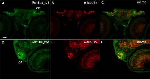 Figure 5. Zebrafish anti-Scn1ba_tv1 and anti-Scn1ba_tv2 stain olfactory pits. A – C: anti-Scn1ba_tv1 (green), anti-acetylated α-tubulin (red). D – F: anti-Scn1ba_tv2 (green), anti-acetylated α-tubulin (red). OP: olfactory pit. Scale bar: 50 μm.