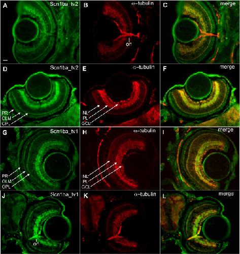Figure 7. Retinal patterning of Scn1ba_tv1 and Scn1ba_tv2. A – F: anti-Scn1ba_tv2 (green), anti-acetylated α-tubulin (red). G – L: anti-Scn1ba_tv1 (green), anti-acetylated α-tubulin (red). Anti-Scn1ba_tv2 stains the layers of the retina, including the ganglion cell layer (GCL), inner plexiform layer (IPL), outer plexiform layer (OPL), outer limiting membrane (OLM), and photoreceptor cell layer (PR). Staining appears to be absent in the inner nuclear layer (INL) and in the optic nerve (on). Anti-Scn1ba_tv1 stains all the layers of the retina including the inner nuclear layer, where it shows robust staining. In contrast to anti-Scn1ba_tv2, anti-Scn1ba_tv1 labels optic nerve. Scale bar: 50 μm.