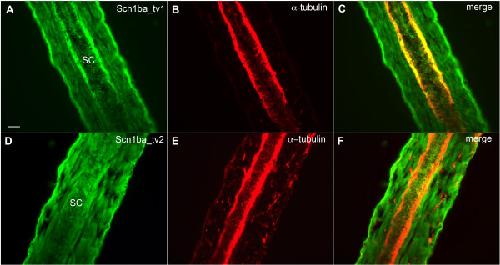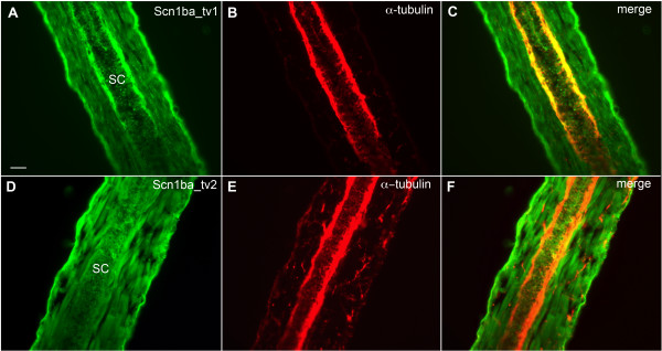 Figure 9. Zebrafish Scn1ba_tv1 and Scn1ba_tv2 are differentially expressed in the spinal cord. A â C: Anti-Scn1ba_tv1 (green), anti-acetylated α-tubulin (red). D â F: Anti-Scn1ba_tv2 (green), anti-acetylated α-tubulin (red). SC: spinal cord. Scale bar: 50 μm.