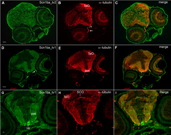 Figure 6. Zebrafish Scn1ba_tv1 and Scn1ba_tv2 are expressed in brain. A – C. Anti-Scn1ba_tv2 (green), anti-acetylated α-tubulin (red). Arrow: optic nerve. Arrowhead: optic chiasm. Anti-Scn1ba_tv2 does not stain the optic nerve or optic chiasm. Scale bar: 20 μm. D – F. Anti-Scn1ba_tv1 (green), anti-acetylated α-tubulin (red). Scn1ba_tv1 staining appears in the optic tectum (TeO), post optic commissure (poc), and optic nerve (arrow). G – I. Anti-Scn1ba_tv1 (green), anti-acetylated α-tubulin (red). Scn1ba_tv1 staining appears in the poc and TeO as well as in the rostral hypothalamus (Hr), but is absent in the subcommisural organ (SCO).