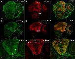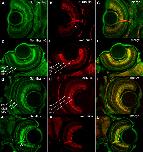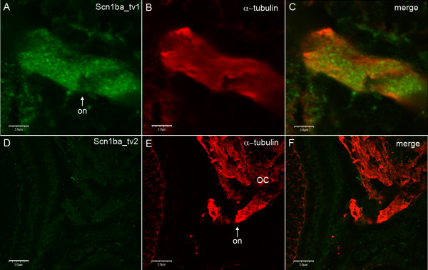 Figure 8. Zebrafish Scn1ba_tv1 but not Scn1ba_tv2 is expressed in optic nerve. Sections generated from 13 dpf zebrafish were stained with anti-Scn1ba_tv1 or anti-Scn1ba_tv2 and anti-acetylated α-tubulin. A – C: Anti Scn1ba_tv1 (green), anti-acetylated α-tubulin (red). D – F: Anti-Scn1ba_tv2 (green), anti-acetylated α-tubulin (red). Images were viewed with an Olympus FluoView 500 confocal microscope at 100× magnification with 5× additional zoom. Scale bar: 50 μm.