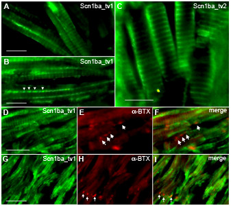 Figure 10. Zebrafish Scn1ba_tv1 and Scn1ba_tv2 are expressed in skeletal muscle. A, B, D, E, F: Anti-Scn1ba_tv1 β1 (green), α-bungarotoxin (BTX) (red). C. Anti-Scn1ba_tv2 (green). Labeling with anti-Scn1ba_tv1 produced two different staining patterns; staining at the t-tubules of striated muscle (A, D, and G), and punctate staining along the longitudinal edge of the muscle cells (arrowheads in B). Staining with anti-Scn1ba_tv2 labeled the t-tubule system and did not appear to label to muscle surface. Anti-Scn1ba_tv1 staining did not colocalize with α-BTX (D – F and H – I), suggesting that Scn1ba_tv1 is not expressed at neuromuscular junctions (arrows). Scale bar: 10 μm.
