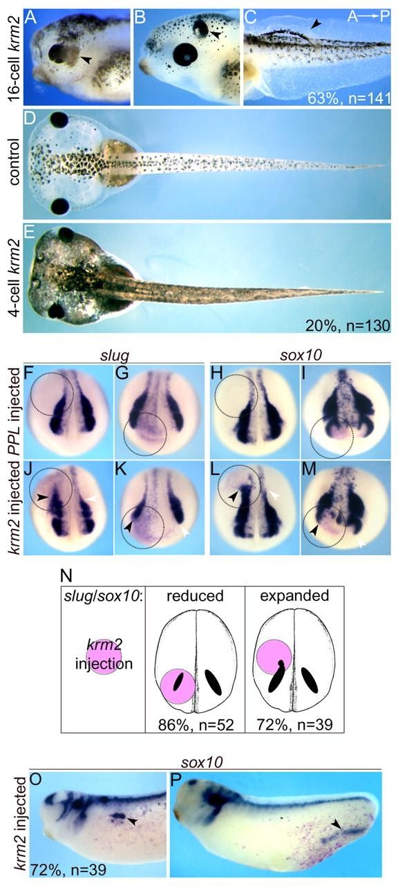 Fig. 2. Krm2 overexpression induces NC-derived structures and NC markers in Xenopus. (A-E) Phenotypic analysis of krm2 overexpression. Anterior to the left. (A-C) Embryos at the 16-cell stage were injected in a single animal (A,B) or ventral equatorial (C) blastomere with 400 pg krm2 mRNA and photographed at tadpole stages. Arrowheads indicate ectopic pigment-containing structures. (D) Uninjected control embryo at tadpole stage. (E) Embryos at the four-cell stage were injected equatorially in both dorsal blastomeres with 400 pg krm2 mRNA each. (F-M) Neurula stage embryos, shown in anterior view. Embryos were injected with 400 pg PPL (F-I) or krm2 (J-M) mRNA into one ventral equatorial blastomere at the 16-cell stage (F,H,J,L) or one dorsal animal blastomere at the 8-16-cell stage (G,I,K,M). In situ hybridizations were performed using slug and sox10 probes as indicated.β -gal lineage tracer is stained in red. Circles indicate lineage-tracer-positive cells. Black and white arrowheads indicate altered and control marker gene expression, respectively. (N) Scheme and statistical overview of experiment shown in F-M. Red area indicates region of krm2-injected cells. (O,P) Embryos were injected as in C and sox10 expression was analyzed at tailbud stage by whole-mount in situ hybridization. Arrowheads indicate ectopic sox10 expression. Co-injected lacZ was used as lineage tracer (red).