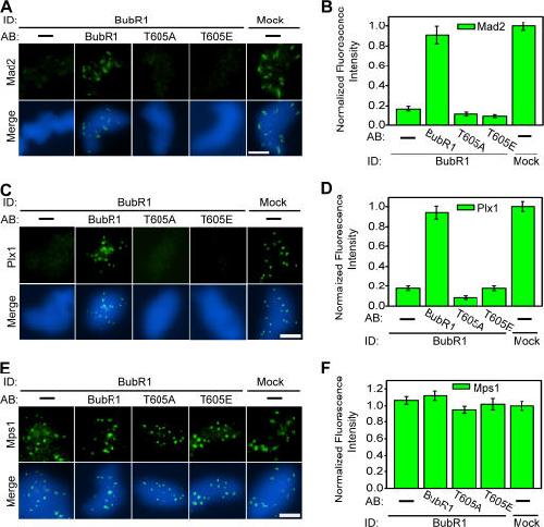 Figure 3. Thr 605 in BubR1 is required for the recruitment of Plx1 and Mad2 to kinetochores. Chromosomes were purified onto coverslips from checkpoint extracts that had undergone immunodepletion and addback of the indicated proteins, as prepared in Fig. 2 A. Purified chromosomes were stained in green for Mad2 (A), Plx1 (C), and Mps1 (E). DNA was stained in blue. Mean fluorescence intensities of Mad2 (B), Plx1 (D), and Mps1 (F) were quantified from 20 kinetochores in different fields and plotted upon normalization to the corresponding values derived from mock-depleted extracts. Error bars represent SEM. Bars, 5 μm.