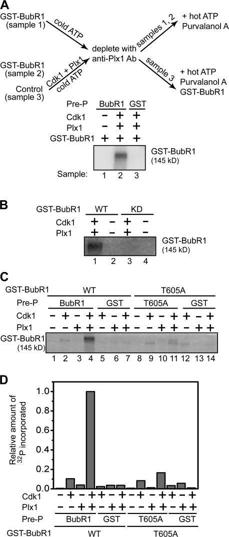 Figure 4. Activation of the BubR1 kinase by Plx1 and Cdk1 is dependent on Thr 605. (A) BubR1 autophosphorylation was assayed as diagramed. Recombinant GST-BubR1 was prephosphorylated (Pre-P) in 0.2 mM of unlabeled ATP in the presence (sample 2) or absence (sample 1) of Plx1 and Cdk1/cyclin B. Plx1 was then removed by anti-Plx1 antibody beads, and prephosphorylated BubR1 was assayed for its autophosphorylation activity in the presence of γ-[32P]ATP and purvalanol A. In a parallel control (sample 3), recombinant GST, not BubR1, was used in the prephosphorylation reaction, and thereafter an aliquot of unphosphorylated GST-BubR1 protein was added before the autophosphorylation reaction. (B) 550 ng each of wild-type BubR1 and kinase-dead mutant was assayed for autophosphorylation after being prephosphorylated by Cdk1 and Plx1 as described in A. (C and D) 550 ng each of recombinant GST-BubR1 (lanes 1–4), GST-BubR1-T605A (lanes 8–11), and GST (lanes 5–7 and 12–14) was prephosphorylated by either Cdk1/cyclin B (lanes 2, 5, 9, and 12) or Plx1 (lanes 3, 6, 10, and 13), or by both kinases (lanes 4, 7, 11, and 14). The autophosphorylation assay was then performed as described in A. In control GST samples (lanes 5–7 and 12–14), unphosphorylated BubR1 (lanes 5–7) or BubR1-T605A (lanes 12–14) were added after the prephosphorylation step but before the autophosphorylation reaction. The extent of autophosphorylation was quantified by measuring the amount of 32P incorporated in BubR1 (D).