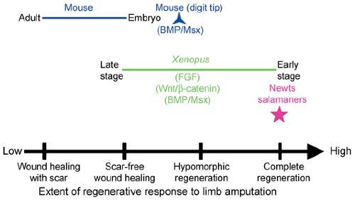 While urodele amphibians (newts and salamanders) can regenerate limbs as adults, other tetrapods (reptiles, birds and mammals) cannot and just undergo wound healing. In adult mammals such as mice and humans, the wound heals and a scar is formed after injury, while wound healing is completed without scarring in an embryonic mouse. Completion of regeneration and wound healing takes a long time in regenerative and non-regenerative limbs, respectively. However, it is the early steps that are critical for determining the extent of regenerative response after limb amputation, ranging from wound healing with scar formation, scar-free wound healing, hypomorphic limb regeneration to complete limb regeneration. In addition to the accumulation of information on gene expression during limb regeneration, functional analysis of signaling molecules has recently shown important roles of fibroblast growth factor (FGF), Wnt/beta-catenin and bone morphogenic protein (BMP)/Msx signaling. Here, the routine steps of wound healing/limb regeneration and signaling molecules specifically involved in limb regeneration are summarized. Regeneration of embryonic mouse digit tips and anuran amphibian (Xenopus) limbs shows intermediate regenerative responses between the two extremes, those of adult mammals (least regenerative) and urodele amphibians (more regenerative), providing a range of models to study the various abilities of limbs to regenerate.