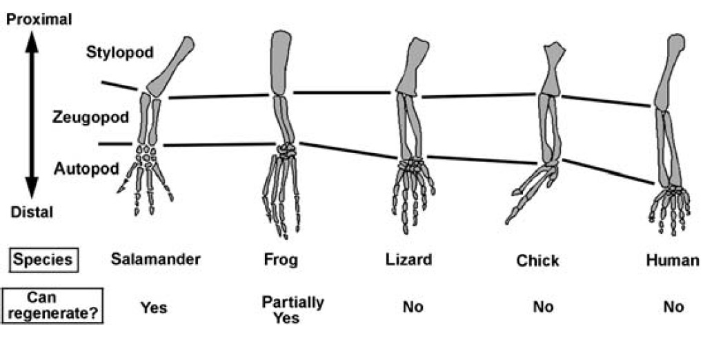 mammals of complete limb regeneration. Signaling in parentheses has been shown to control regenerative capacity in such models by