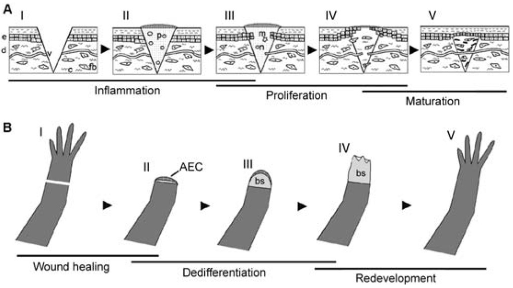 c, collagen d, dermis; e, epidermis; fb, fibroblast; m, macrophage; n, neurotrophil; p, platelet; v, blood vessel. (B) Limb regeneration