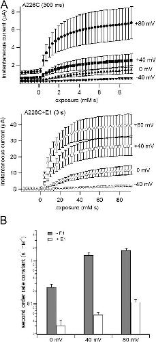 Figure 4. MTS reaction rate is voltage dependent. (A) Time courses of MTSES reaction with A226C (300 ms) and A226C+KCNE1 (3 s) with depolarization to −40, 0, +40, and +80 mV are shown. (B) Apparent second order rate constants are plotted against voltage. Although time courses of the reaction with depolarizations to +40 and +80 mV were fitted with double exponential function, only the faster time constants were used for the calculation of the apparent second order rate constants. Filled bars represent rate constants without KCNE1, open bars the rate constants with KCNE1.