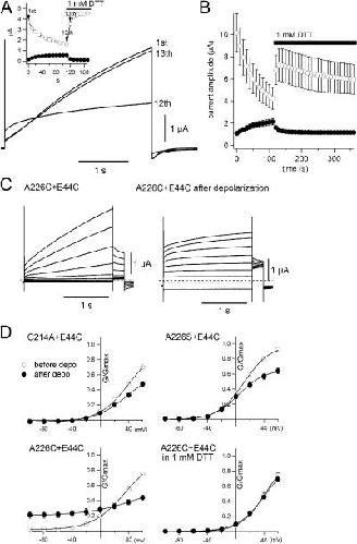 Figure 6. A disulfide bond can form between KCNE1 and S4 of KCNQ1. (A) Current traces recorded from an oocyte coexpressing KCNQ1 (A226C) and KCNE1 (E44C) are shown. The oocyte was repetitively depolarized to +40 mV for 3 s every 10 s. Only the 1st, 12th, and 13th traces are shown. The current gradually ran down until by the 12th depolarization it was nearly flat. With subsequent addition of 1 mM DTT, the current immediately recovered the slow activation (13th depolarization). Thereafter, slow activation was retained in DTT. (inset) Time course of the run down and recovery by DTT. Filled and open symbols represent the instantaneous currents and the currents at the end of the depolarization, respectively. Black bar represents the presence of 1 mM DTT in the bath solution. (B) Time course of current amplitude upon DTT application (n = 5). Filled and open symbols represent the instantaneous currents and the currents at the end of the depolarization, respectively. Black bar represents the presence of 1 mM DTT in bath solution. (C) Representative traces obtained from oocyte coexpressing KCNQ1 A226C mutant and KCNE1 E44C mutant. Membrane potential was stepped from a holding potential of −100 to +60 mV in 20-mV increments. After the first set of voltage pulses (left), oocyte is depolarized at +40 mV for 1 min to facilitate the disulfide formation. Second set of voltage pulses was applied after 1 min depolarization (right). (D) G-V curves for the KCNQ mutants with KCNE1 (E44C) mutant. Open and filled symbols represent G-V curves before and after 1 min depolarization at +40 mV, respectively.