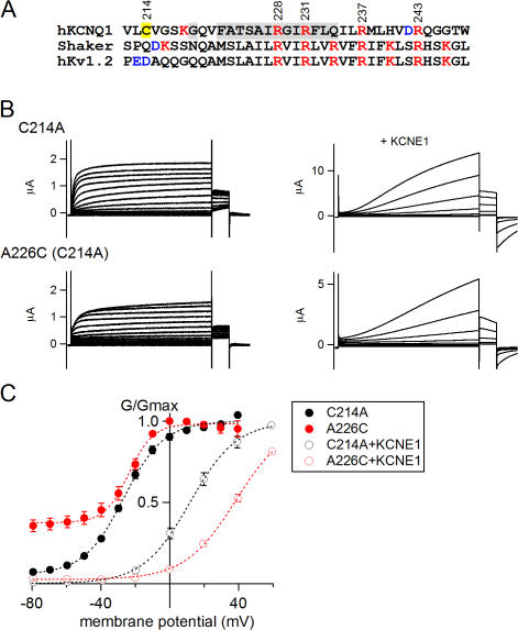 Figure 1. Cysteine-scanning mutagenesis of the S4 segment of the KCNQ1 channel. (A) Amino acid sequences of the S3–S4 linker and S4 segment of human KCNQ1 (hKCNQ1), Drosophila Shaker (Shaker), and human Kv1.2 (hKv1.2) are aligned. Amino acids substituted with cysteine are shaded in gray. Endogenous cysteine (C214; yellow) was substituted with alanine in all mutants. Positively and negatively charged amino acids are indicated in red and blue, respectively. (B) Representative traces for C214A and A226C in the absence and presence of KCNE1. Membrane potential was depolarized for 2 s from −80 to +40 mV in 10-mV steps in the absence of KCNE1 and from −80 to +60 mV in 20-mV steps in the presence of KCNE1. (C) Conductance–voltage (G-V) relationships for C214A (black) and A226C (red) with (open symbols) and without (filled symbols) KCNE1 are shown. Data are fitted with Boltzmann equation (dotted curves, see Materials and Methods).