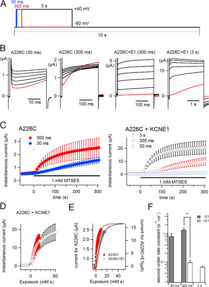 Figure 3. MTS reaction rate is slowed in the KCNQ1–KCNE1 complex. (A) Pulse protocols for MTSES application. Depolarizing pulses (to +40 mV) with durations of 30 ms (blue), 300 ms (red), or 3 s (black) were applied every 10 s. (B) Representative traces for A226C (30 ms), A226C (300 ms), A226C+KCNE1 (300 ms), and A226C+E1 (3 s). Traces obtained just before applying MTSES are shown in red; those obtained 1, 2, 3, 4, and 5 min after the onset of MTSES application are shown in black. (C) Time courses of the MTSES reaction with A226C and A226C+KCNE1 with 30-ms (blue), 300-ms (red), and 3-s (black) depolarizing pulses. The timing of the MTSES application is indicated by black bars. (D) Time courses of MTSES reaction are replotted as functions of “exposure (mM sec)” (see Materials and Methods) of A226C+KCNE1 elicited by 30-ms (blue), 300-ms (red), and 3-s (black) depolarizing pulses. (E) Time courses of the MTSES reaction with 300-ms pulses in terms of “exposure” are compared between A226C and A226C+KCNE1 (E1). Filled red symbols represent A226C, open black symbols A226C+KCNE1. (F) Apparent second order rate constants are plotted. Although time courses of MTSES reaction with A226C (300 ms) and A226C+KCNE1 (3 s) were fitted by a double exponential function, only the faster time constants were used for calculation of the apparent second order rate constants. Filled bars represent rate constants without KCNE1, open bars the rate constants with KCNE1; **, P < 0.01.