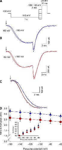 Figure 2. Effect of Ts1 in the Cole-Moore shift. (A) Voltage protocol used to measure the Cole-Moore shift. (B, top) Superimposed sodium currents obtained in the absence of Ts1, following a prepulse to −60 mV (lefthand trace) or −160 (righthand trace). (B, bottom) Superimposed sodium currents obtained in the presence of Ts1 (100 nM), elicited as described above for the control conditions. (C) Superimposed sodium currents (prepulses to −160 mV) recorded in control conditions (blue line) and in the presence of Ts1 (red line). Black lines are the fits to the function in Eq. 1 (see Materials and Methods). Arrows in A and B indicate the beginning of the pulse. (D) Time to the half-maximal sodium current for indicated potentials in control conditions (blue triangles) and in the presence of Ts1 (red circles). The inset shows the time shift necessary to superimpose the currents for the indicated potentials with respect to the currents at −160 mV (control, blue triangles; in presence of Ts1, red circles). Blue and red lines are the fits to the function shown in Eq. 2. The parameters obtained for the curve in the absence of Ts1 were z = 2.3; Vh = 0 mV; the parameters obtained in the presence of Ts1 were z = 4.4; Vh = −17.7 mV. |