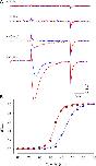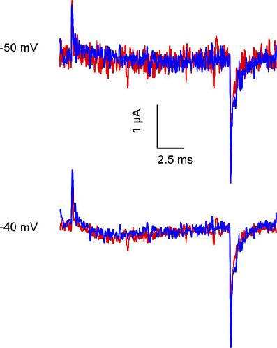Figure 4. Effect of Ts1 on S4-DII movement. Effect of Ts1 in R663C channels. Superimposed traces of the TMRM-labeled R663C channel recorded at −50 mV (first panel) and −40 mV (second panel) before (blue traces) and after the treatment with 1 μM of Ts1 (red traces). |