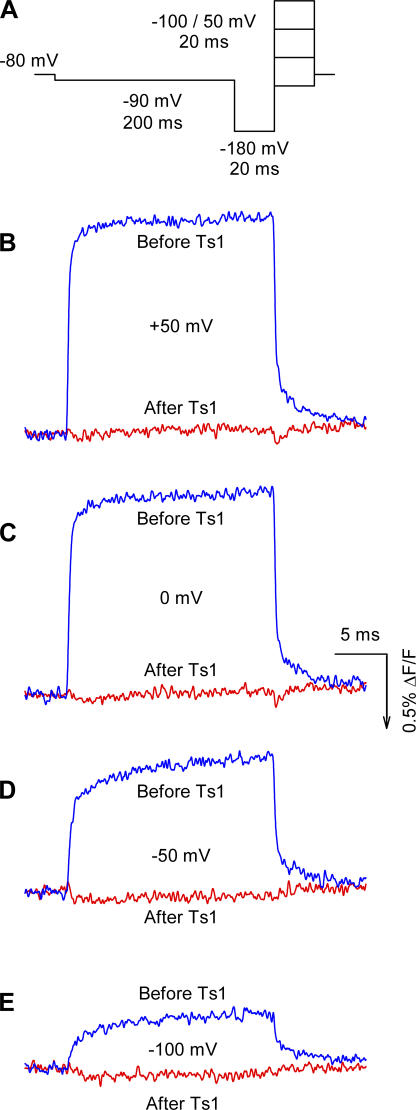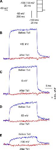 Figure 6. Effect of Ts1 on S4-DII movement. (A) Voltage protocol used to measure the fluorescence signals. Superimposed fluorescence traces recorded at +50 mV (C), 0 mV (D), −50 mV (E), and −100 mV (F) in control conditions (blue lines) and in the presence of Ts1 (0.5 μM, red lines). The fluorescence increases in the same direction of the arrow in the scale bar. |