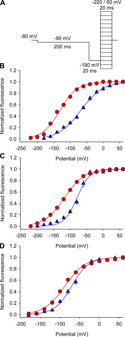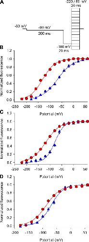 Figure 8. Effect of Ts1 on S4-DI, S4-DIII, and S4-DIV movements. (A) Voltage protocol used to measure the fluorescence signals. (B–D) F-V relationships for domains I (S216C) (B), III (L1115C) (C), and IV (S1436C) (D) in absence (blue triangles) and presence of Ts1 (50 nM, red circles). Solid lines are the fits to the function in Eq. 5 (see Materials and Methods). See Table II for fitted parameters. |