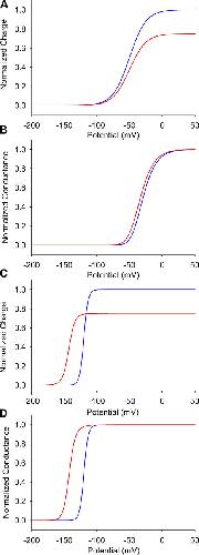 Figure 10. Modulation of gating in independent and allosteric models. Simulations of the charge–voltage (A) and conductance–voltage curves (B) for the model with independent voltage sensors. Charge–voltage (C) and conductance–voltage (D) curves in the allosteric model, where all four voltage sensor movements are coupled. Toxin-modified data are shown as red lines, whereas the unmodified traces are shown as blue lines. |