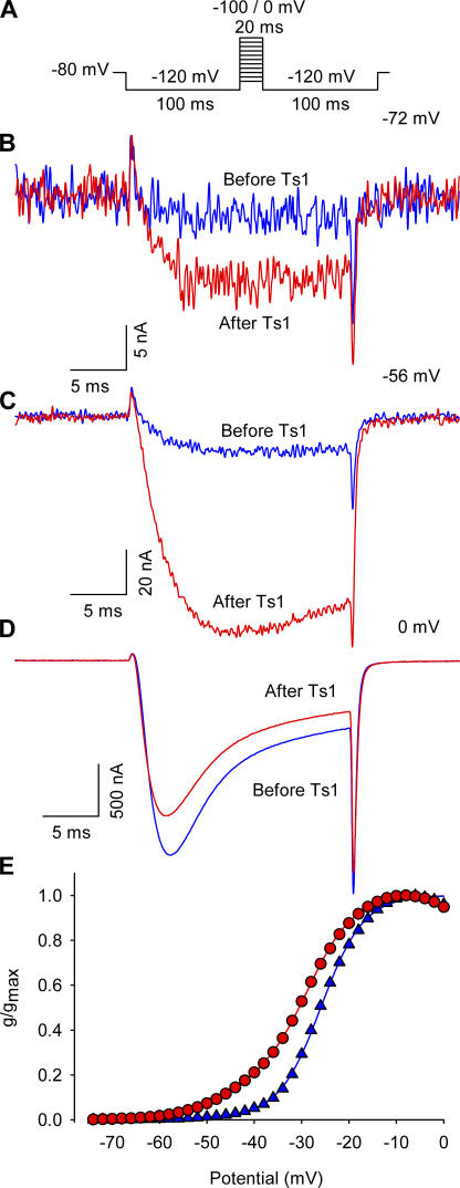 Figure 1. Effect of Ts1 in the sodium currents activation. (A) Voltage protocol used to record the inward sodium currents. (B) Superimposed sodium currents obtained at −72 mV before (blue trace) and after (red trace) the treatment with 50 nM of Ts1. (C) Superimposed sodium currents obtained at −56 mV before (blue trace) and after (red trace) the treatment with Ts1 (50 nM). (D) Superimposed sodium currents obtained at 0 mV before (blue trace) and after (red trace) the treatment with Ts1 (50 nM). (E) Superimposed G-V curves obtained before (blue symbols) and after (red symbols) the treatment with Ts1 (25 nM). |