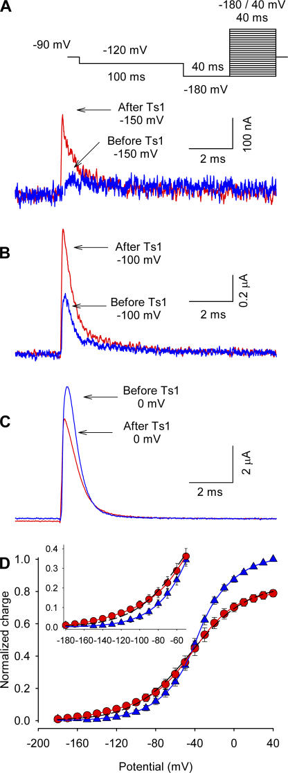 Figure 3. Effect of Ts1 on gating currents. Superimposed gating current traces elicited by a test pulse to −150 mV (A), −100 mV (B), and 0 mV (C) in control conditions (blue line) and in the presence of 50 nM Ts1 (red line). (A, inset) Voltage protocol used to record the currents. (D) Charge–voltage (Q-V) relationships (normalized to the maximum charge in control conditions) in the presence of Ts1 (red circles) and in control conditions (blue triangles). Solid and dashed traces are the fits to the function in Eqs. 3 and 4, respectively (see Materials and Methods). See Table I for fitted parameters. |