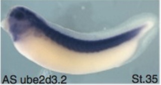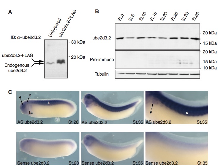 Fig. 2 Embryonic expression of ube2d3.2. (now called ube2d4) (A) A polyclonal antibody raised to amino acids 1â147 of ube2d3.2 was used to probe control embryos (uninjected) and embryos expressing FLAG-tagged ube2d3.2(-FLAG). (B) Equal quantities of total embryonic protein