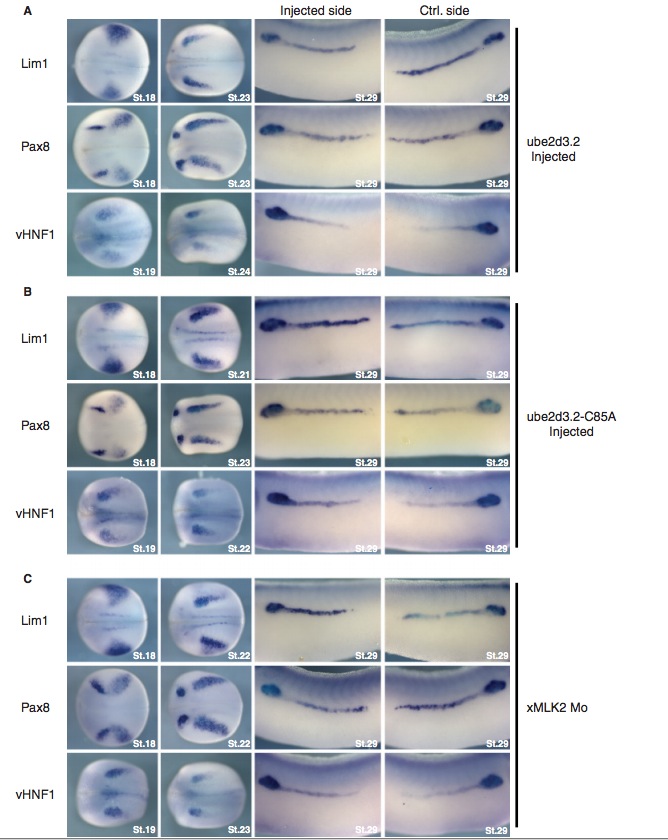 Fig. 4 Ube2d3.2 affects pronephros formation. (C) Two-cell stage embryos were injected unilaterally