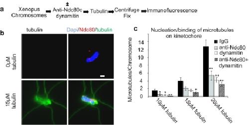 Fig. 1. Dynein/dynactin and the Ndc80 complex additively contribute to microtubule binding at kinetochores of isolated chromosomes. Isolated Xenopus chromosomes in buffer were incubated in the presence or absence of dynamitin protein and anti-Ndc80 complex antibody. After addition of buffer, 10, 15, or 20 μM tubulin, microtubule assembly was initiated, then chromosomes were centrifuged onto coverslips and fixed for immunofluorescence. a Protocol for testing nucleation/binding of microtubules to kinetochores on isolated Xenopus chromosomes. b Immunofluorescence images comparing chromosomes incubated without tubulin (upper panels) to chromosomes incubated with 15 μM tubulin (lower panels). c Quantification of microtubules bound per chromosome. Addition of nonimmune control IgG was used as a control. Dynamitin protein and anti-Ndc80 complex antibodies individually cause a reduction of microtubule association. The combined addition of both dynamitin protein and anti-Ndc80 results in additive reduction in microtubule binding. In comparison to control, for dynamitin, the p value was less than 0.001 at concentrations of tubulin of 10 and 20 μM and less than 0.05 at a concentration of tubulin of 15 μM, n = 50; for the anti-Ndc80 complex antibody, the p value was less than 0.05 for tubulin at 10 μM, was equal to 0.07 at 15 μM, and was less than 0.001 at 20 μM tubulin, n = 50; for dynamitin protein and anti-Ndc80 together, the p value was less than 0.001 at all three concentrations of tubulin, n = 50