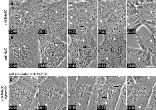 Fig. 5. Inhibition of the Ndc80 complex in mitotic cells with bipolar spindles induces loss of metaphase alignment and forced exit from M phase. Image sequences from two prometaphase Xenopus S3 cell microinjected with antibodies against Ndc80 protein (a) or Nuf2 protein, n = 4 (b), components of the Ndc80 complex (injection at time point 00:00). Both antibodies cause a similar phenotype. The mitotic spindle continued to mature as the spindle poles (white arrowheads) separated. At a time point 8–9 min after injection, most chromosomes became clustered loosely near the spindle equator. Approximately 15 min after injection, anaphase ensued, indicated by the separation of the two sister chromatids (black arrows). However, sister chromatids remained at the spindle equator without any poleward anaphase movement. Movies (Movies 5 and 6) corresponding to cells in a and b are available in the supplementary material. c Simultaneous inhibition of the Ndc80 complex and dynein/dynactin leads to loss of kinetochore-driven chromosome movement in prometaphase cells. Image sequence from a Xenopus S3 cell treated with 25 μM MG132 for 30 min then coinjected with anti-Ndc80 complex antibodies and dynamitin protein at time point 00:00. Major chromosome movements gradually ceased, and many chromosome became aligned parallel to the spindle axis and often took on an “accordion-like” wrinkled morphology, perhaps because of the interaction of chromosome arms with spindle microtubules (black arrows). During this time, the spindle poles (white arrowheads) moved further apart. The proteasome inhibitor, MG132, was used to inhibit anaphase onset and mitotic exit which ordinarily occurs in cells injected with anti-Ndc80 complex antibodies. Movie 9 corresponding to this cell is available in the supplementary material. Bar = 10 μm
