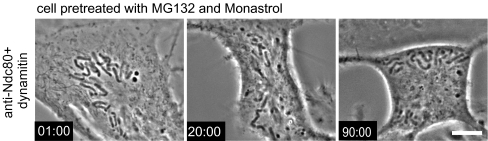Fig. 4. Simultaneous inhibition of Ndc80 complex and dynein/dynactin in cells with monopolar spindles leads to eventual loss of chromosome poleward movement and orientation toward spindle poles. Cells were pretreated with monastrol (3 μM) to prevent spindle pole separation and with MG132 (25 μM) to block premature mitotic exit. Cells were injected with anti-Ndc80 antibody and dynamitin, n = 4 cells. Chromosomes show progressive loss of movement and orientation toward the spindle poles such that by 90 min, most chromosomes become localized near the cell periphery
