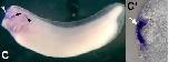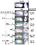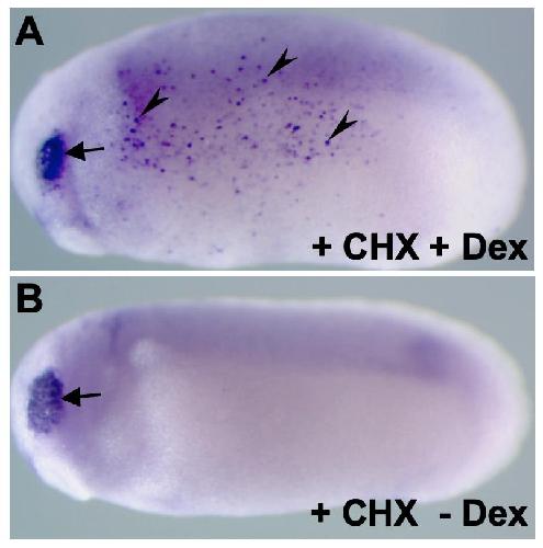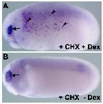 Supplemental Figure S6 (Adobe PDF) Fig. S6. Activation of FoxE3 by hormone-inducible versions of Su(H) and Otx2 under conditions of inhibition of protein synthesis by cycloheximide. We injected mRNAs encoding GR-Su(H)VP16 (750 pg) and Otx2-GR (250 pg) into a ventral blastomere of 4-cell stage embryos to target expression in the trunk ectoderm. When the injected embryos reached stages 22-24, they were placed for 1 hour into medium containing cycloheximide (10 µg/ml). According to our previous data (Martynova et al., 2004), this period of time is sufficient to block total protein synthesis by more than 90%. After this period, dexamethasone (Dex) was added to the same incubation medium at a 10 µM final concentration to release activities of the previously accumulated GR-Su(H)VP16 and Otx2-GR proteins. Under these conditions, only direct targets of Su(H) and Otx2 should be activated because mRNA translation is blocked by cycloheximide. After 2 hours of incubation with Dex, the embryos were processed for in situ hybridization with FoxE3 probe. Ectopic FoxE3 expression was detected in the trunk ectoderm of 60% of these embryos (n=48, A, arrowheads), whereas it was not detected in any sibling embryos incubated in the cycloheximide-containing medium but without Dex (n=53, B). Arrows in A and B indicate endogenous FoxE3 expression in the PLE. Cycloheximide (Sigma) was prepared as a 10 mg/ml stock solution in ethanol and stored at −20°C; this stock solution was freshly diluted to 10 µg/ml in 0.3×MMR for culturing embryos. Martynova, N., Eroshkin, F., Ermakova, G., Bayramov, A., Gray, J., Grainger, R. and Zaraisky, A. (2004). Patterning the forebrain: FoxA4a/Pintallavis and Xvent2 determine the posterior limit of Xanf1 expression in the neural plate. Development131, 2329-2338. |
