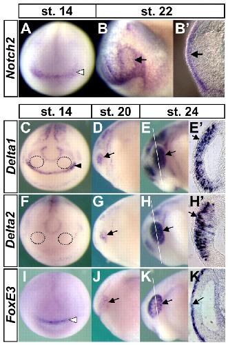 Fig. 4. Comparative expression analysis of Notch signaling components and FoxE3 in X. laevis embryos, showing that Notch2 and FoxE3 are expressed in PLE, while Delta1 and Delta2 are expressed in presumptive retina. Expression of Notch2 (A-Bâ²), Delta1 (C-Eâ²), Delta2 (F-Hâ²), and FoxE3 (I-Kâ²) was detected by in situ hybridization from neural plate stages to early tailbud stages. Regions circled with black dotted lines in C and F are the approximate presumptive retina fields, where neither Delta1 nor Delta2 is expressed. Arrows in B,Bâ², D-Eâ², G-Hâ² and J-Kâ² indicate expression of Notch2, Delta1, Delta2 and FoxE3, respectively. The black arrowhead in C indicates Delta1 expression in the anterior neural ridge, and white arrowheads in A and I indicate Notch2 and FoxE3 expression in the pre-placodal ectoderm, respectively. White lines in E,H,K indicate the planes of transverse eye sections shown in Eâ²,Hâ²,Kâ². |