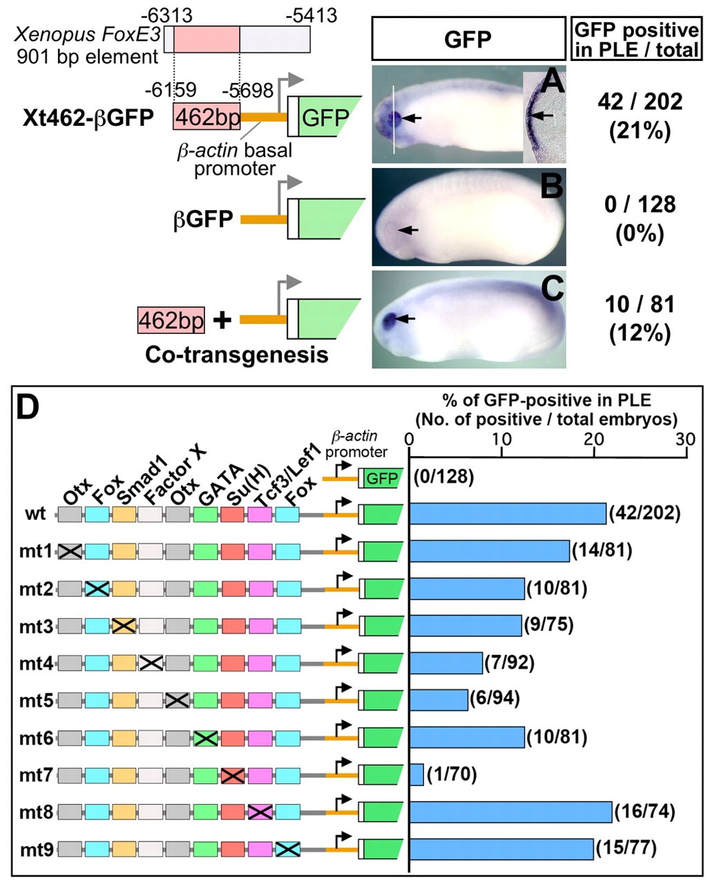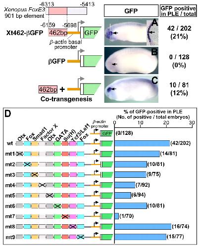 Fig. 3. Mapping of regulatory motifs essential for PLE-specific activity of the FoxE3 enhancer. (A-C) Representative transgenic embryos (stages 22-24) generated with the GFP reporter constructs shown on the left. Black arrows indicate the PLE. Numbers of embryos with GFP expression in the PLE and the total number of normally (or near normally) developing embryos injected with each construct are indicated on the right-hand side with percentages of the GFP-positive cases. The white line in A indicates the plane of the transverse section shown in the inset. The black arrow in the inset indicates GFP expression in the PLE overlying the optic vesicle. The embryo shown in C was generated by co-transgenesis, i.e. co-injection of the 462 bp enhancer of Xenopus FoxE3 amplified by PCR along with the βGFP cassette. (D) Identification of transcription factor-binding motifs essential for PLE-specific expression by mutation analysis. wt is the construct used in Fig. 3A (Xt462-βGFP). mt1-mt9 were generated from wt/Xt462-βGFP by introducing a base-substitution mutation (cross) into each of the conserved transcription factor-binding motifs. The bar chart shows the percentage of the embryos that showed GFP expression in the PLE among total developed embryos injected with the constructs shown on the left. Actual numbers of GFP-positive cases and total numbers of scored embryos are indicated in parentheses. |