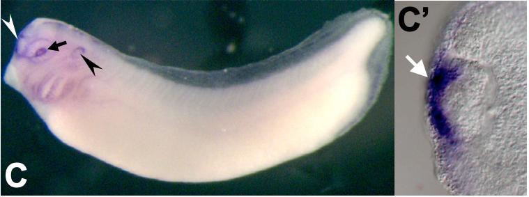 Supplemental Figure S5 (C,C′) In situ hybridization analysis of XNotch2 (BX855333) expression in late-tailbud embryos. Expression is evident in the lens vesicle (black arrow), olfactory placode (white arrowhead) and otic vesicle (black arrowhead) (C). A transverse eye section shows the localized expression in the lens epithelium (white arrow, C′). |