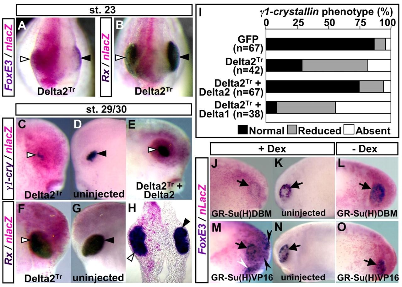 Fig. 5. Effects of manipulation of Notch signaling on FoxE3 expression and subsequent lens placode formation. (A,B) Frontal view of Xenopus embryos injected with mRNA encoding Delta2Tr (500 pg), fixed at stage 23, and subjected to lacZ staining (magenta) and in situ hybridization with FoxE3 or Rx probe (purple or deep purple staining). White and black arrowheads in A-H indicate in situ hybridization signals on injected and uninjected sides of embryos, respectively. (C,D,F,G) The injected and uninjected sides of embryos injected with Delta2Tr mRNA, fixed at stages 29/30, and hybridized with γ1-crystallin or Rx probe. (H) A transverse head section of the embryo shown in F,G. (E) The injected side of an embryo injected with both Delta2Tr mRNA (500 pg) and wild-type Delta2 mRNA (500 pg), fixed at stage 29, and hybridized with γ1-crystallin probe. (I) Summary of Delta2Tr mRNA injection experiments. GFP mRNA (1000 pg) was injected as a control. (J,K) The injected and uninjected sides, respectively, of an embryo injected with GR-Su(H)DBM mRNA (1000 pg) and induced with Dex. Arrows in J-O indicate endogenous FoxE3 expression in the PLE. (L) The injected side of an embryo injected with GR-Su(H)DBM but not induced with Dex. (M,N) The injected and uninjected sides, respectively, of an embryo injected with GR-Su(H)VP16 mRNA (1000 pg) and induced with Dex. Black and white arrowheads in M indicate ectopic FoxE3 expression in the ectoderm overlying the anterior brain and that surrounding the cement gland, respectively. (O) The injected side of an embryo injected with GR-Su(H)VP16 but not induced with Dex. |