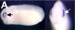 foxe3 (forkhead box E3) gene expression in X. tropicalis embryo, NF stage 23, assayed via in situ hybrodization, lateral view (left) and anterior view (right), dorsal up. |