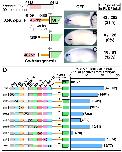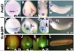 Supplemental Figure S1 (Adobe PDF) Fig. S1. GFP expression driven by a 10.6 kb FoxE3 promoter closely recapitulates PLE-specific expression of endogenous FoxE3. GFP expression in Xenopus embryos injected with −10.6kGFP was examined by in situ hybridization (E-H). At neural plate stages (stages 13-15), GFP expression was detected in the pre-placodal ectoderm adjacent to the anterior margin of the neural plate (39%, n=44, E). After neural tube formation (stages 22-24), the expression was confined to the PLE overlying the developing optic vesicle and to the presumptive oral ectoderm (32%, n=135, F). In the late-tailbud embryos (stages 31-33), GFP expression was observed in the developing lens placode derived from the PLE and in the oral ectoderm, and additionally in cranial ganglia (57%, n=61, G and H). Comparison of the GFP expression with endogenous FoxE3 expression in X. tropicalis embryos detected by in situ hybridization (A-D) identified minor differences in the oral ectoderm, cranial ganglia and thyroid primordium (compare B-D and F-H). However, the GFP expression closely recapitulates the endogenous FoxE3 expression in the pre-placodal ectoderm, PLE and lens placode, indicating that the −10.6 kb region tested here contains all the information necessary for the expression in the lens lineage. Comparison of the GFP expression detected by in situ hybridization with that by epifluorescent microscopy (I-L) revealed a significant delay between its transcription and fluorescence development, which was likely to be caused by the time required for maturation and/or accumulation of GFP proteins (Tsien, 1998) (compare E-H and I-L). Triangles indicate expression in the pre-placodal ectoderm (A,E,I); red arrows indicate the PLE (B,F,J,K) and the lens placode (C,D,G,H, L); blue arrows indicate the presumptive oral ectoderm (B,F,G,J,K). tp, thyroid primordium; cg, cranial ganglia. Tsien, R. Y. (1998). The green fluorescent protein. Annu. Rev. Biochem.67, 509-544. Supplemental Figure 2 |