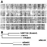 Fig. S5. [A, B] A Xenopus laevis EST clone (NCBI accession BX855333) was identified as a partial cDNA clone of Xenopus Notch2. (A) An amino acid sequence encoded by BX855333 (indicated as XNotch2) is aligned with partial amino acid sequences of mouse Notch proteins and Xenopus Notch1 (mNotch2, mNotch3, mNotch4, mNotch1 and XNotch1; NCBI accession NP035058, NP032742, NP035059, NP032740 and AAB02039). This alignment and the phylogenetic tree (B) were both generated on the ClustalW website (http://www.ebi.ac.uk/clustalw/). XNotch1 is the only Notch family member previously reported in Xenopus (Chitnis et al., 1995). (B) A phylogenetic tree showing evolutionary distances between the protein encoded by BX855333 and other Notch family proteins. Note that BX855333 is closest to mouse Notch2. ( |