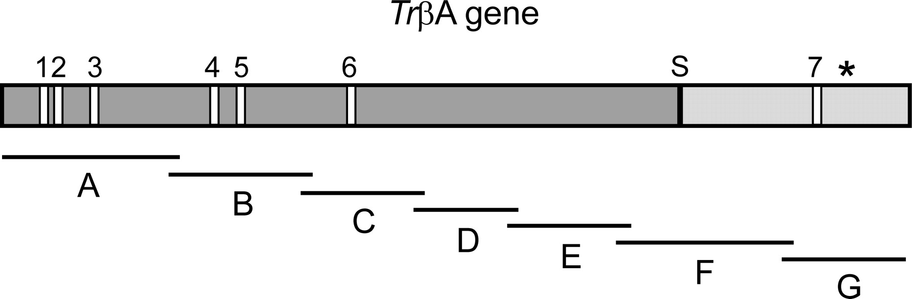 Schematic representation of the X. laevis TrβA gene with locations of GC boxes and regions analyzed by EMSA and ChIP assay. The bars with letters below indicate the general regions of the TrβA gene targeted for analysis by EMSA and in the ChIP assay and correspond to the specific sequences given in supplemental Table 1. The numbering of the seven GC boxes corresponds to that given in Table 4. The dark gray filled box represents the upstream region, the S indicates the transcription start site, the light gray filled box represents the 5′-UTR, and the asterisk indicates a TRE that has been characterized and proposed to mediate T3-dependent transactivation (40, 58).