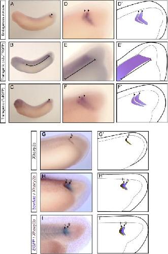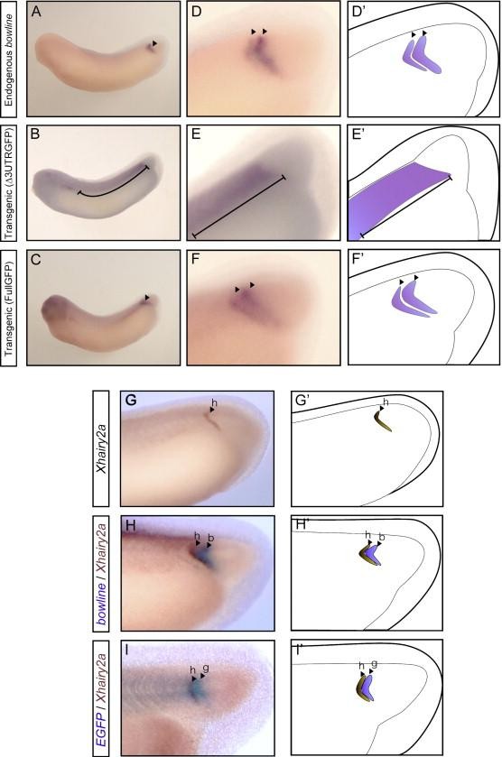 Fig. 1. Isolation of a bowline upstream region, and reconstitution of bowline expression in transgenic embryos. (A) In situ hybridization for endogenous bowline. (B, C) In situ hybridization for EGFP reporter gene in transgenic embryos with δ3UTRGFP (B), or with FullGFP (C). (DâF) Magnified views of panels A (D), B (E), and C (F). (Dâ²âFâ²) Schematic diagrams of gene expression in panels D (Dâ²), E (Eâ²), and F (Fâ²). (G) In situ hybridization for endogenous Xhairy2a (h, brown). (H) Double in situ hybridization for Xhairy2a (h, brown) and bowline (b, blue) in wild-type embryos. (I) Double in situ hybridization for Xhairy2a (h, brown) and EGFP reporter gene (g, blue) in transgenic embryos with FullGFP. (Gâ²âIâ²) Schematic diagrams of gene expression in panels G (Gâ²), H (Hâ²), and I (Iâ²). Arrowheads indicate segmental patterns of expression. The bar indicates the broad expression pattern in transgenic embryos with δ3UTRGFP.